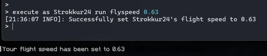 // If the speed was set by a different sender (Like using /execute) sender.sendRichMessage("Successfully set <playername>'s flight speed to " + speed, Placeholder.component("playername", player.name())); player.sendPlainMessage("Your flight speed has been set to " + speed); return Command.SINGLE_SUCCESS; }) );